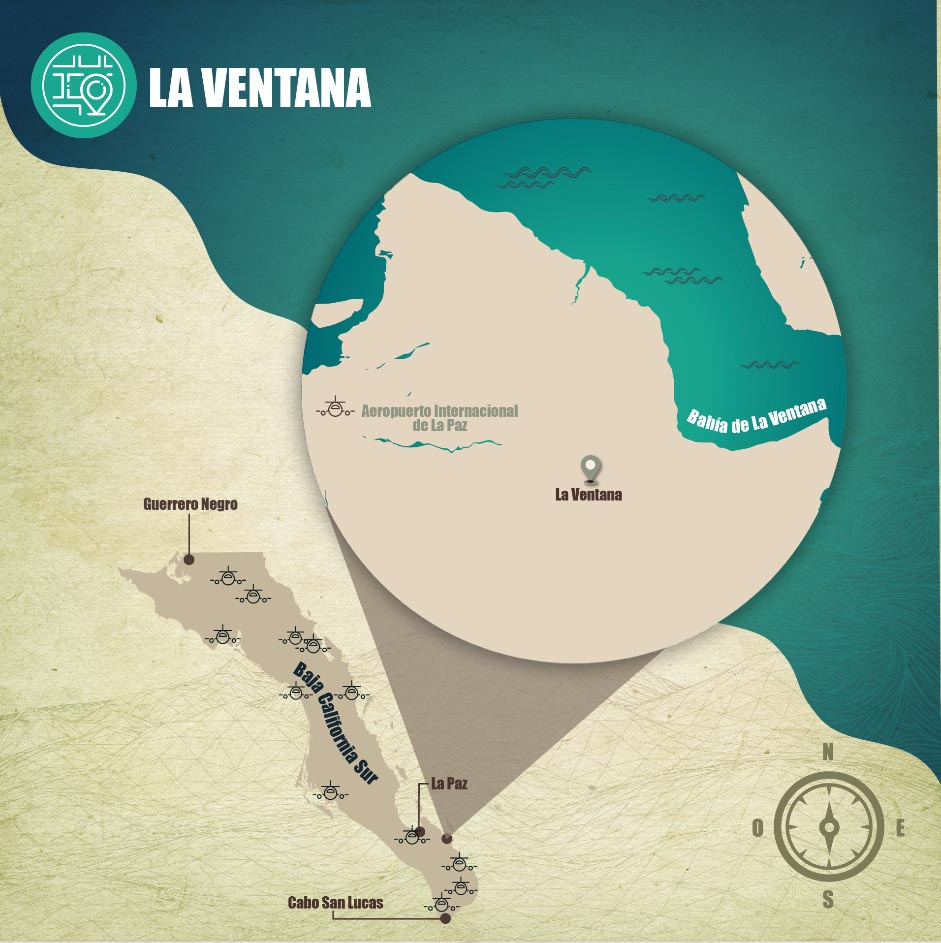 La Ventana, es una pequeña comunidad a tan solo 45 minutos de La Paz que se ha posicionado rápidamente como la capital del kitesurf a nivel mundial y que además ofrece múltiples actividades y atractivos como ciclismo de montaña, renta de ATV´s, hermosas playas, aguas termales, SUP, paseos a la Isla Cerralvo, retiros de yoga, pesca deportiva e inigualable gastronomía de pescados y mariscos.