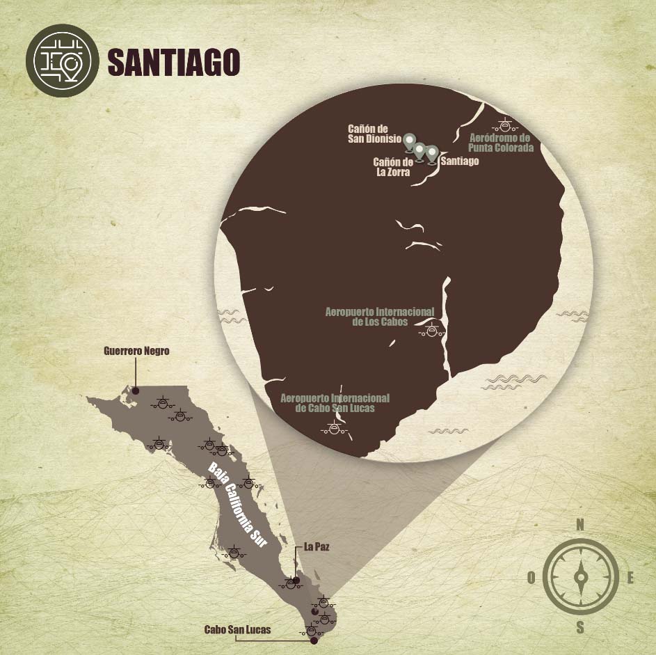 Santiago es también puerta de entrada a la Reserva de la Biósfera Sierra La Laguna ideal para realizar distintas actividades como excursionismo, cañonísmo, campismo, avistamiento de aves, entre otros. Las caminatas en los Cañones de la Zorra y San Dionisio permiten explorar la naturaleza inesperada de este sitio, así como tener intercambios culturales con los rancheros de la zona.