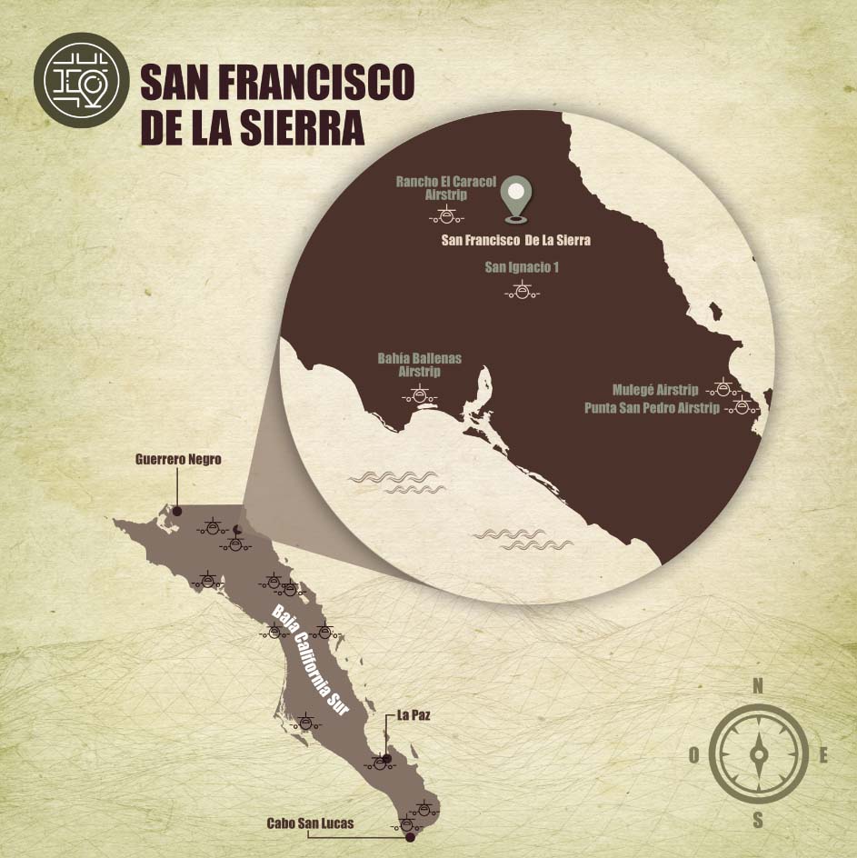 - Desde guerrero negro, tomar la carretera # 1 hacia el sur, alrededor del km 100 tomar la desviación hacia la izquierda señalizada como San Francisco de La Sierra, en carretera estatal sin número.