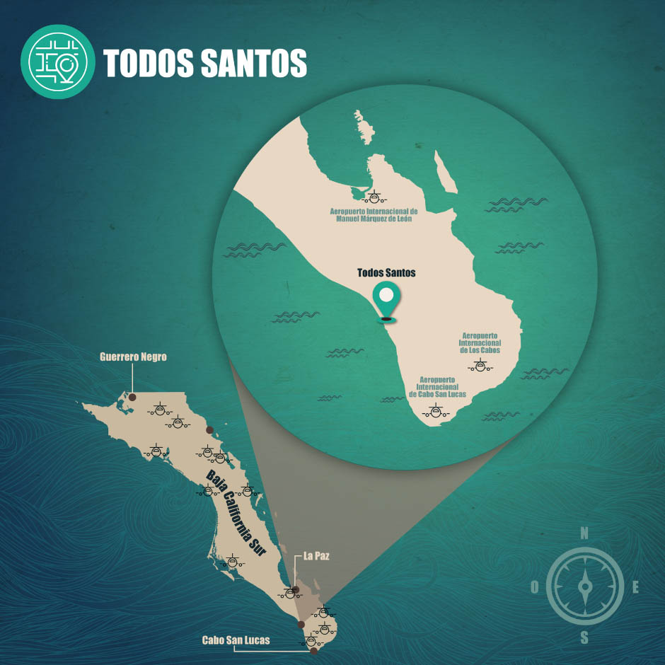 Todos Santos es una localidad en la costa del Pacífico que se ubica a 76kms al Norte de Los Cabos yendo por la carretera 19 (misma que unos kilómetros más adelante entronca con la Ruta 1) es una parada obligada como uno de los principales sitios que visitar al recorrer la Ruta.