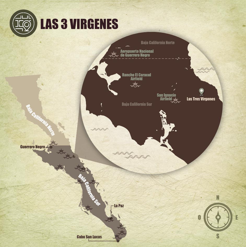Sobre la Ruta 1, rumbo a la comunidad minera de Santa Rosalía, se debe tomar la desviación que lleva a la Ranchería de las Tres Vírgenes para llegar al Volcán mismo que se encuentra dentro la Reserva de la Biósfera El Vizcaíno.